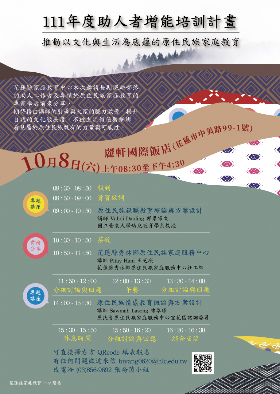花蓮縣家庭教育中心本次邀請長期深耕部落的助人工作者及專精於原住民族家庭教育的專家學者前來分享,期待藉由講師的引導與大家的腦力激盪,提升自我的文化敏感度,不被主流價值觀綑綁,看見屬於原住民族既有的力量與可能性。