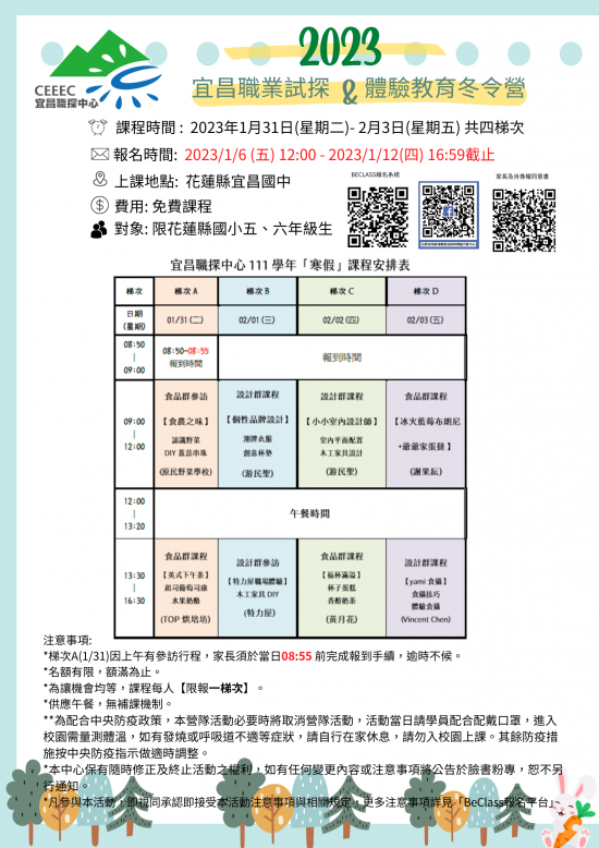 宜昌國民中學開設花蓮縣區域職業試探與體驗示範 中心111學年度寒假營隊海報及肖像權同意書,歡迎5-6年級生踴躍報名參加
