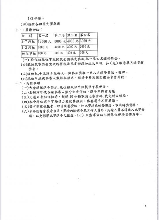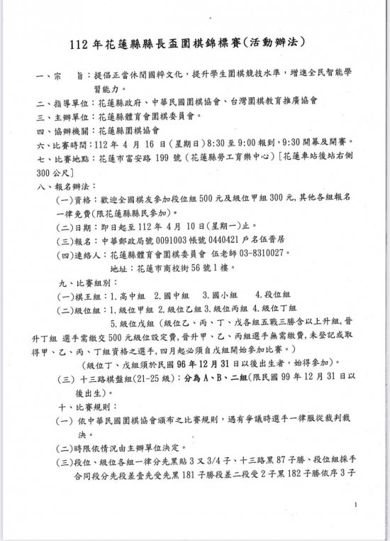 轉知112年花蓮縣縣長盃圍棋錦標賽活動辦法