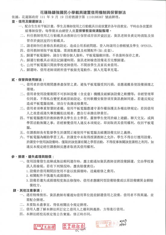 花蓮縣鑄強國民小學載具建置借用機制與保管辦法