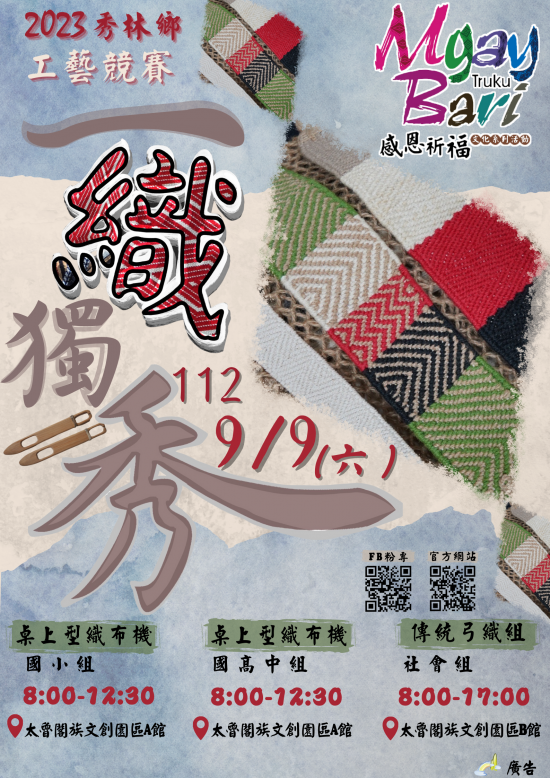 檢送本所「花蓮縣秀林鄉2023 Truku Mgay Bari感恩祈福文化系列活動實施計畫【一織獨秀工藝競賽】」1案,敬請宣傳報名參加,請查照。 |