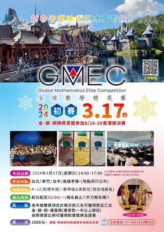 有關「2024 年全球數學菁英賽初賽(Global Mathematics Elite Competition,簡稱GMEC)」將於 2024 年 3 月 17 日(日)舉行,敬請 貴校推薦學生參賽,與國際數學接軌,發掘優秀人才,為國爭光,惠請協助,不勝感激。