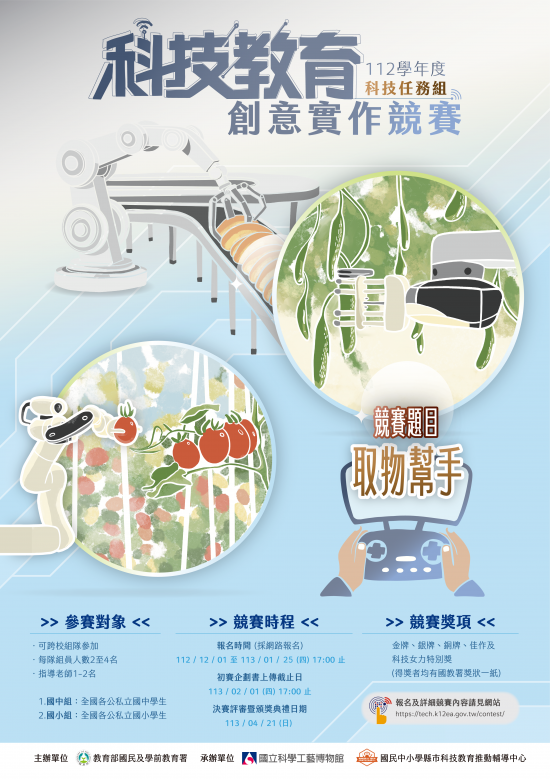 三、 | 本競賽限網路報名,報名時間延長至113年1月25日(週四)下午5時止,詳細競賽資訊可參閱網頁: https://tech.k12ea.gov.tw/contest/ |