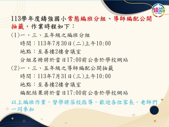 113學年度鑄強國小常態編班分組、導師編配公開抽籤,作業時程如下: