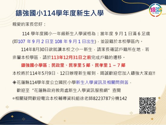 114年8月30日欲就讀本校之小一新生,請家長確認戶籍所在地,若非屬本校學區,請於113年12月31日之前完成戶籍的遷移。