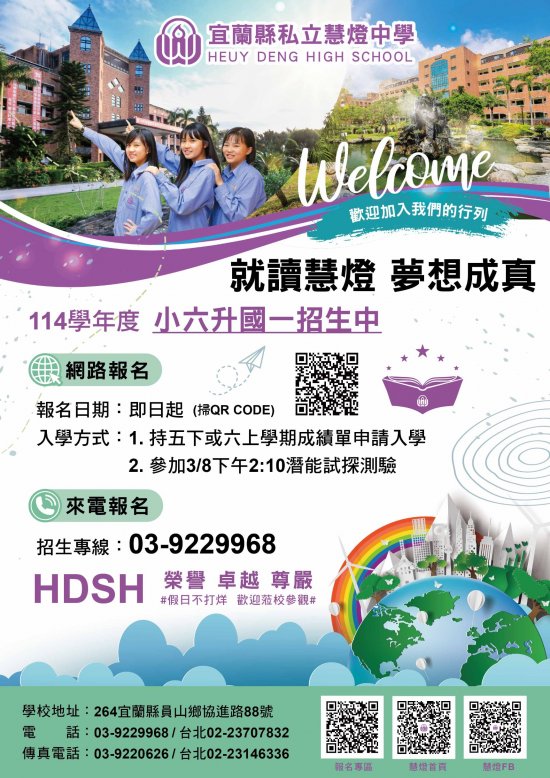 六、活動詳細資訊請參閱附件海報。若有任何疑問,請撥打03-9229968分機147慧燈中學招生處洽詢。