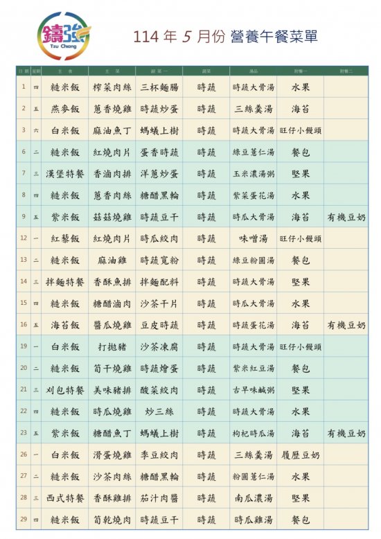 113學年度下學期 5月營養午餐菜單上菜囉~~