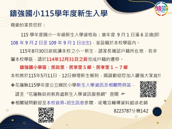 ²花蓮縣115學年度公立國民小學新生入學資訊及相關問與答,