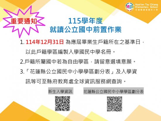 3.「花蓮縣公立國民中小學學區劃分表」及入學資訊等可至縣府教育處全球資訊服務網查詢。