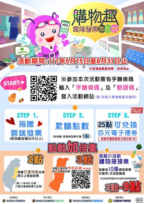 於111年5月15日起至8月31日舉辦「購物趣~雲端發票集點樂」雲端發票線上活動,藉以鼓勵民眾購物消費使用載具索取雲端發票,請貴機關協助轉知所屬單位及同仁並放置於FB粉絲團、官網、LINE、跑馬燈及電視牆等推廣,至紉公誼。 |