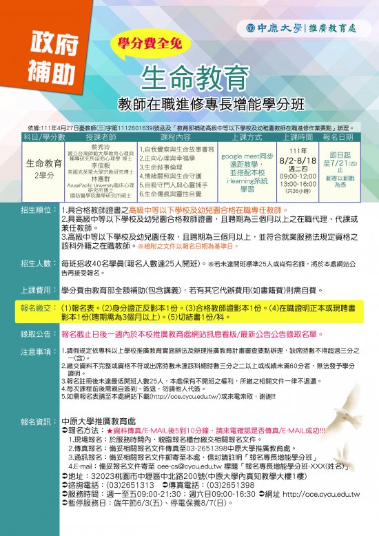 中原大學 函檢送本校辦理111年度高級中等以下學校教師在職進修專 長增能學分班「第二外語會話(泰語)」及「生命教育」課 程簡章各1份,請查照並惠予公告。