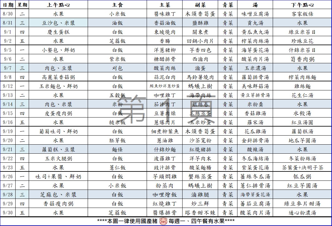 公告111.8~9月菜單