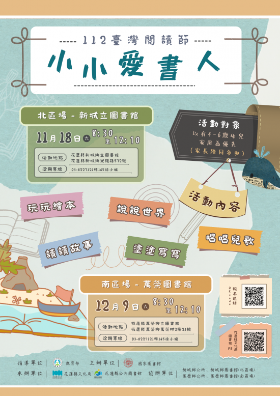 (二)第二場(南區) 時間:112年12月9日(六),上午8時至中午12時20分。 地點:萬榮鄉立圖書館 (花蓮縣萬榮鄉萬榮村2鄰23號)