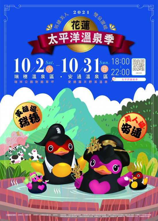 一、 旨揭活動訂於110年10月2日至10月31日辦理,以「英雄美人‧雙泉濯暖」為活動主題,特別於花蓮瑞穗溫泉區與安通溫泉區規劃兩大名湯「瑞穗英雄湯」及「安通美人湯」,並建置特色光影展區、裝置藝術及繽紛燈廊等,以推廣本縣溫泉觀光旅遊,詳細活動資訊請見活動官網(http://www.hlhs.com.tw)及花蓮觀光粉絲團(https://www.facebook.com/hltour/)。