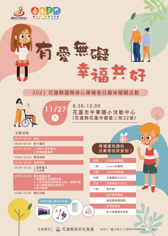 二、 本活動以三大主軸為主,分別為「無障礙生活闖關活動」、「『希兒與皮帝的神奇之旅』繪本說故事活動」、「身心障礙服務成果展示」,現場透過VR、圖卡、拼圖、繪本等多元媒材體驗不同障礙類別日常生活暨身心障礙福利推動成果展示,現場備有闖關限量好禮及摸彩活動精美大禮,誠摯邀請共襄盛舉。